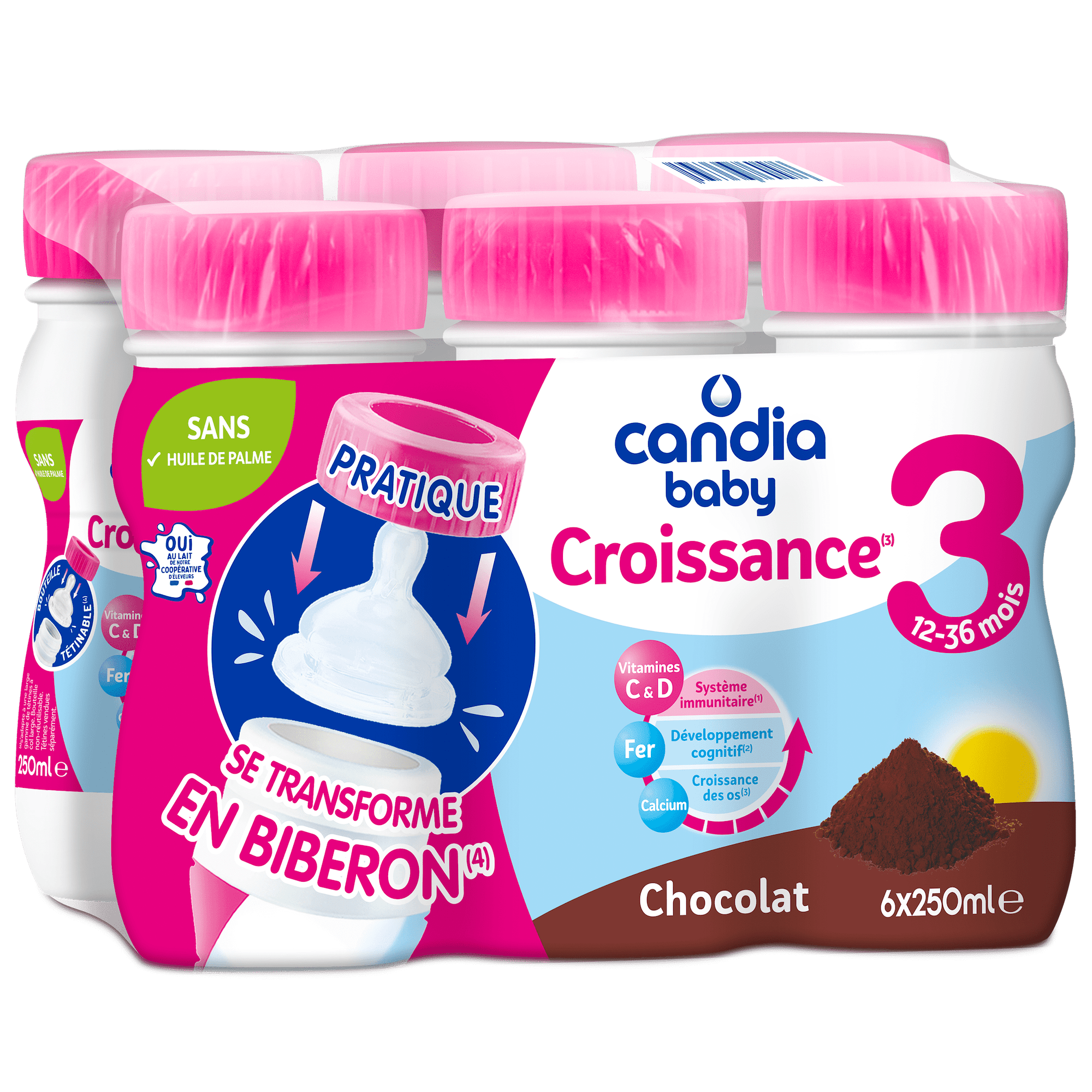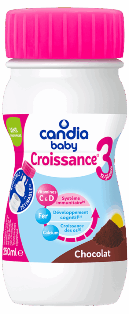 Lait de croissance 3ème âge au chocolat Découvrez le lait de croissance 3ème âge Candia Baby aromatisé au chocolat qui contient de la vitamine D nécessaire à une croissance et un développement osseux normaux des enfants.